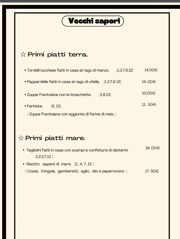 La cucina tipica lucchese è il cuore pulsante del nostro menù. Il nostro ristorante si impegna a rispettare le antiche ricette, rielaborandole con un tocco di modernità senza mai tradire la loro autenticità.